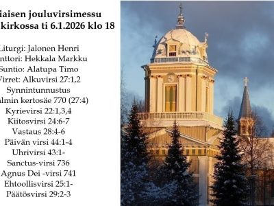 Kauneimmat joululaulut -messu ti 6.1.2026 klo 14 Keskuskirkosta. Tervetuloa!