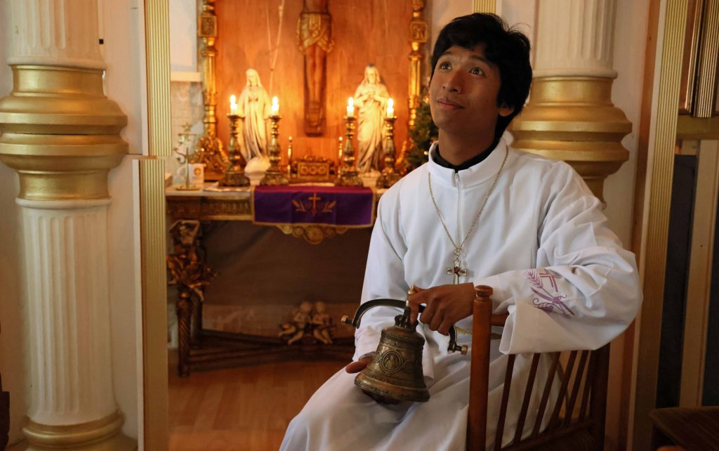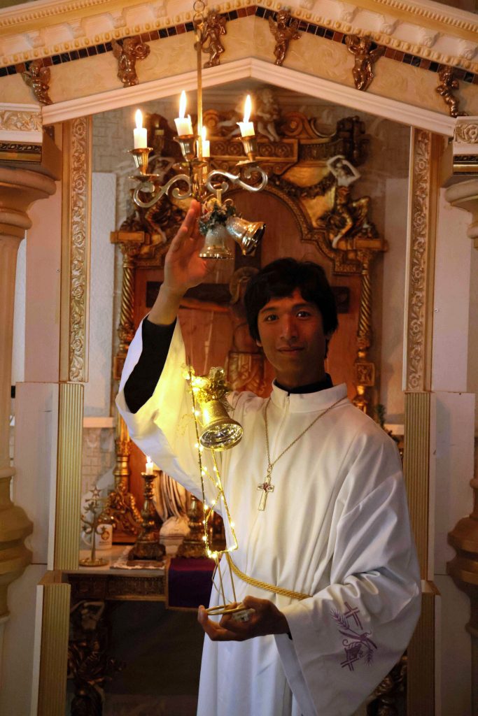 Nummelinin kappeli valaistaan aina elävin kynttilöin. Ikkunat on pimennetty. Koska juttelemme joulusta, Nummelin on pukeutunut valkoiseen kaapuun, jonka uskonnollisaiheiset kirjailut ovat vaalean lilan väriset.