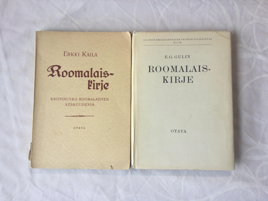 Kuvassa kaksi kirjaa, jotka käsittelevät Roomalaiskirjettä.