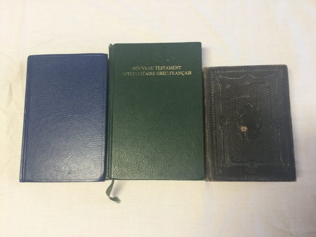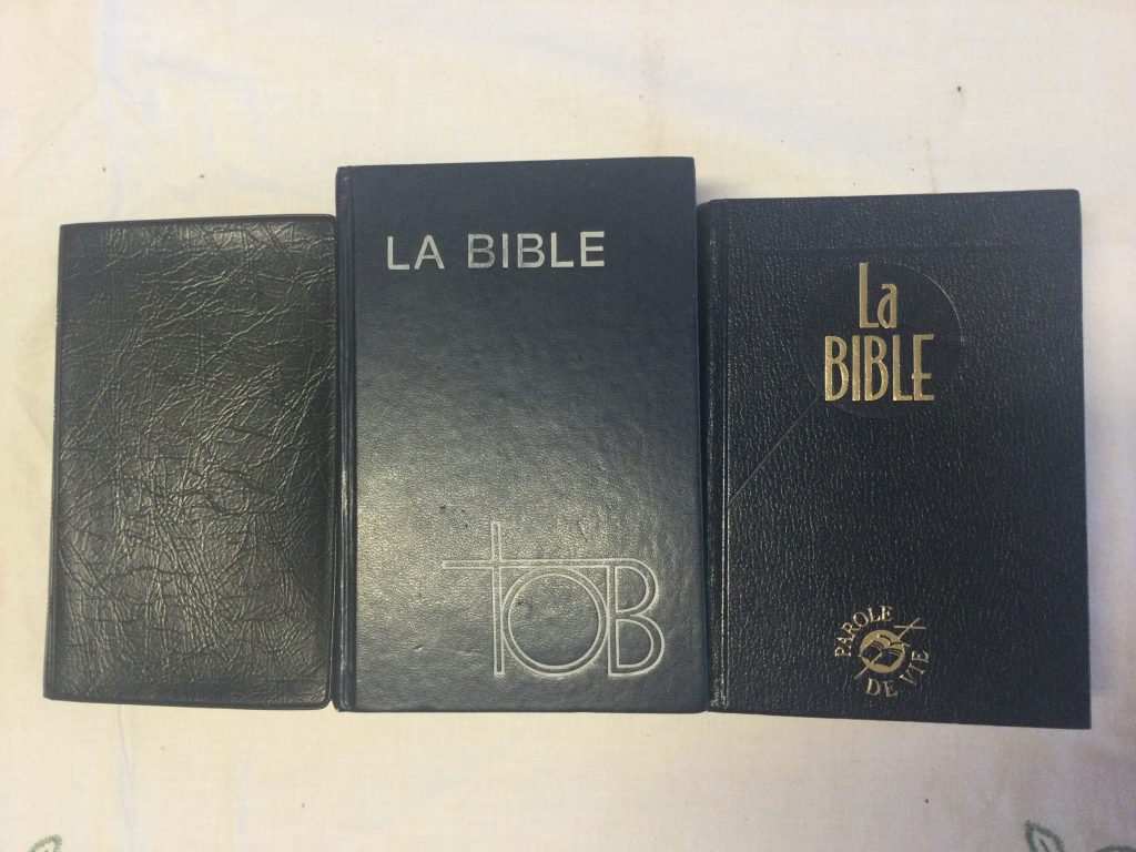 Ranska on toinen kotikielemme. Ranskaksi on kotonamme monia erilaisia Raamattuja tai sen osia. Tässä kuvassa kolme eri käännöstä.