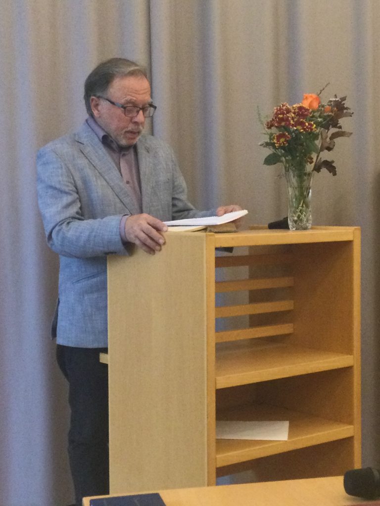Kuvassa Loimaan evankelisen kansanopiston Toveriliiton sihteeri Eino Knuutila puhuu Someron seurakuntakeskuksessa torstaina 23.10.2025 Toveriliiton vieraillessa rakkaassa seurakunnassamme.