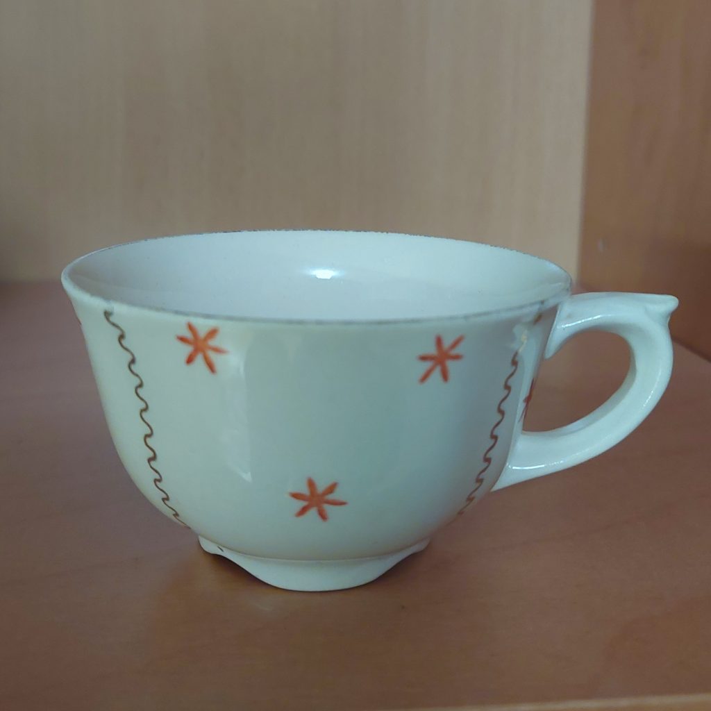 Kuvassa Mummun ja Papan kahvikuppi 1930- ja 1940-lukujen taitteesta. Malli AS, koriste Viktoria (1938-1942).