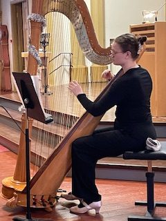 Kuvassa Inkeri Lintervo soittaa harppua Someron kirkossa 14.12.2025 klo 10 messussa. Oli ilo kuunnella hänen soittoaan.