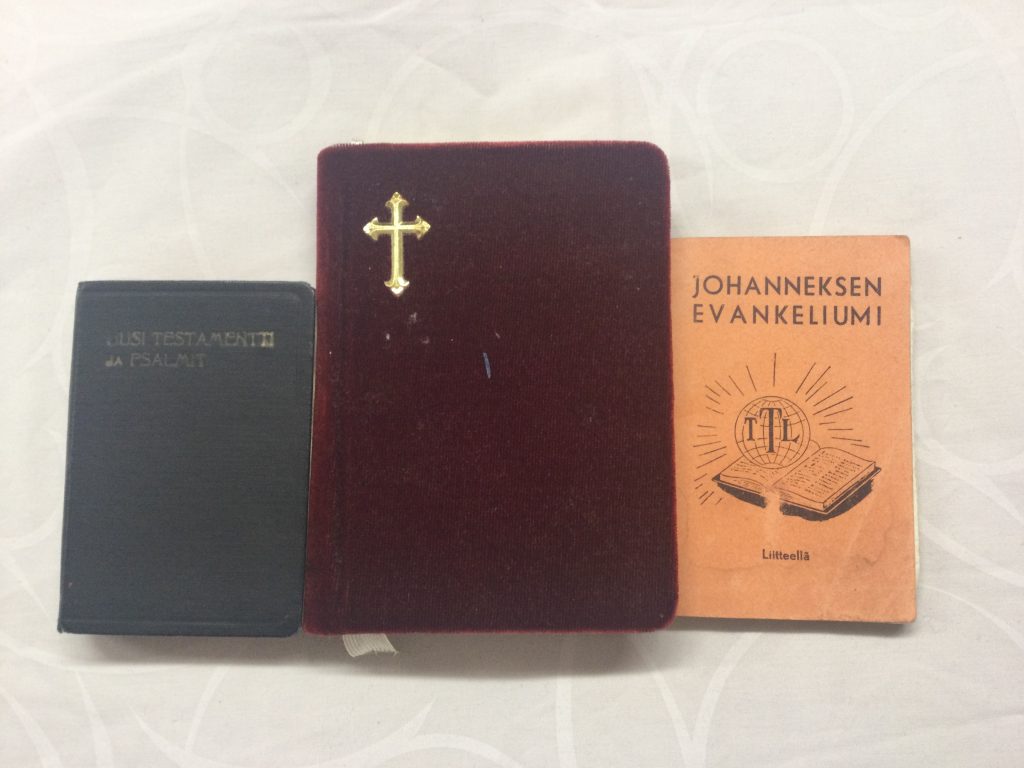 Vasemmalla Uusi testamentti ja Psalmit on samaa kokoa kuin oli käytössä nuoruuteni aikana. Se oli helppo kuljettaa mukana, ei vienyt paljoa tilaa.