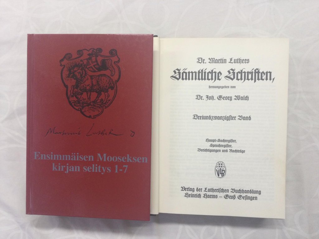 Kuvassa vasemmalla suomennos Lutherin viimeisestä luentosarjasta, jonka hän piti ensimmäisestä Mooseksen kirjasta. Kuvassa kuusiosaisen teoksen ensimmäinen osa.