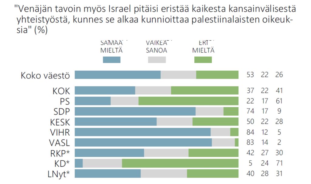 KYSELYN MUKAAN yli puolet on sitä mieltä että ”Venäjän tavoin myös Israel pitäisi eristää kaikesta kansainvälisestä yhteistyöstä, kunnes se alkaa kunnioittaa palestiinalaisten oikeuksia”. Neljäsosa vastaajista (26 prosenttia) oli eri mieltä.
