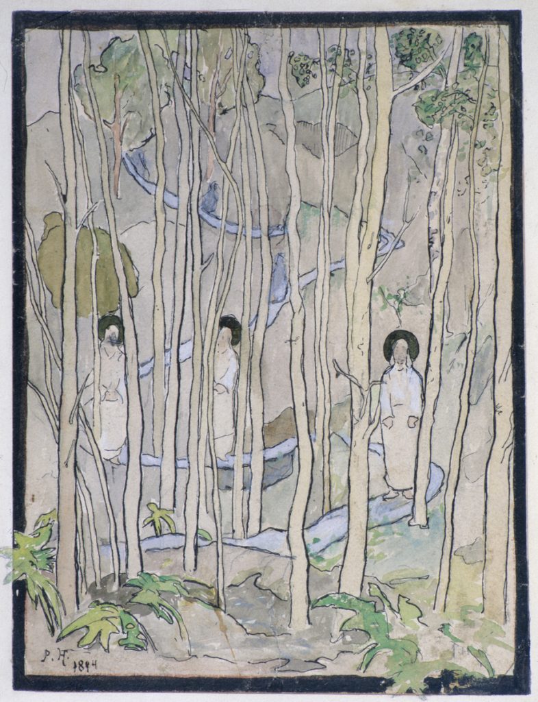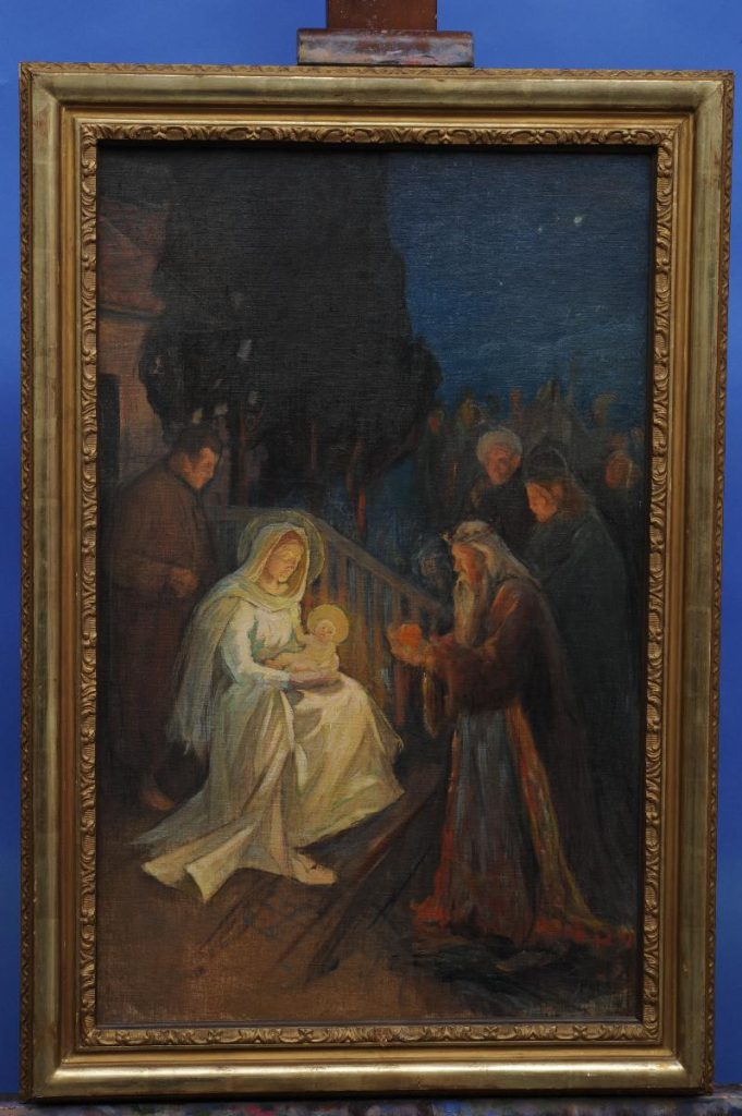 MUISTA ALTTARITAULULUONNOKSISTA on esillä esimerkiksi ensimmäinen toteutunut alttaritaulu, Pedersören kirkon Viimeinen ehtoollinen (1895–96) sekä Kotkan kirkon Kuninkaitten kumarrus (1898–1899). Ateljeen pianonurkkaukseen, joka muistuttaa kotikonserteista, on sijoitettu Halosen Kolme pyhää miestä metsässä (1894) yhdessä Luumäen kirkon alttaritaululuonnoksen Kristuksen kasteen (1913) kanssa. Akvarelli Kolme pyhää miestä metsässä oli Halosen luonnosehdotus hänen synnyinpaikkansa Lapinlahden kirkon alttaritauluksi. Sitä ei tilattu, ja aihetta pidettiin poikkeavana. Näyttelykokonaisuudessa Paul Gauguiniin (1848–1903) yhdistetty teos on moderni.