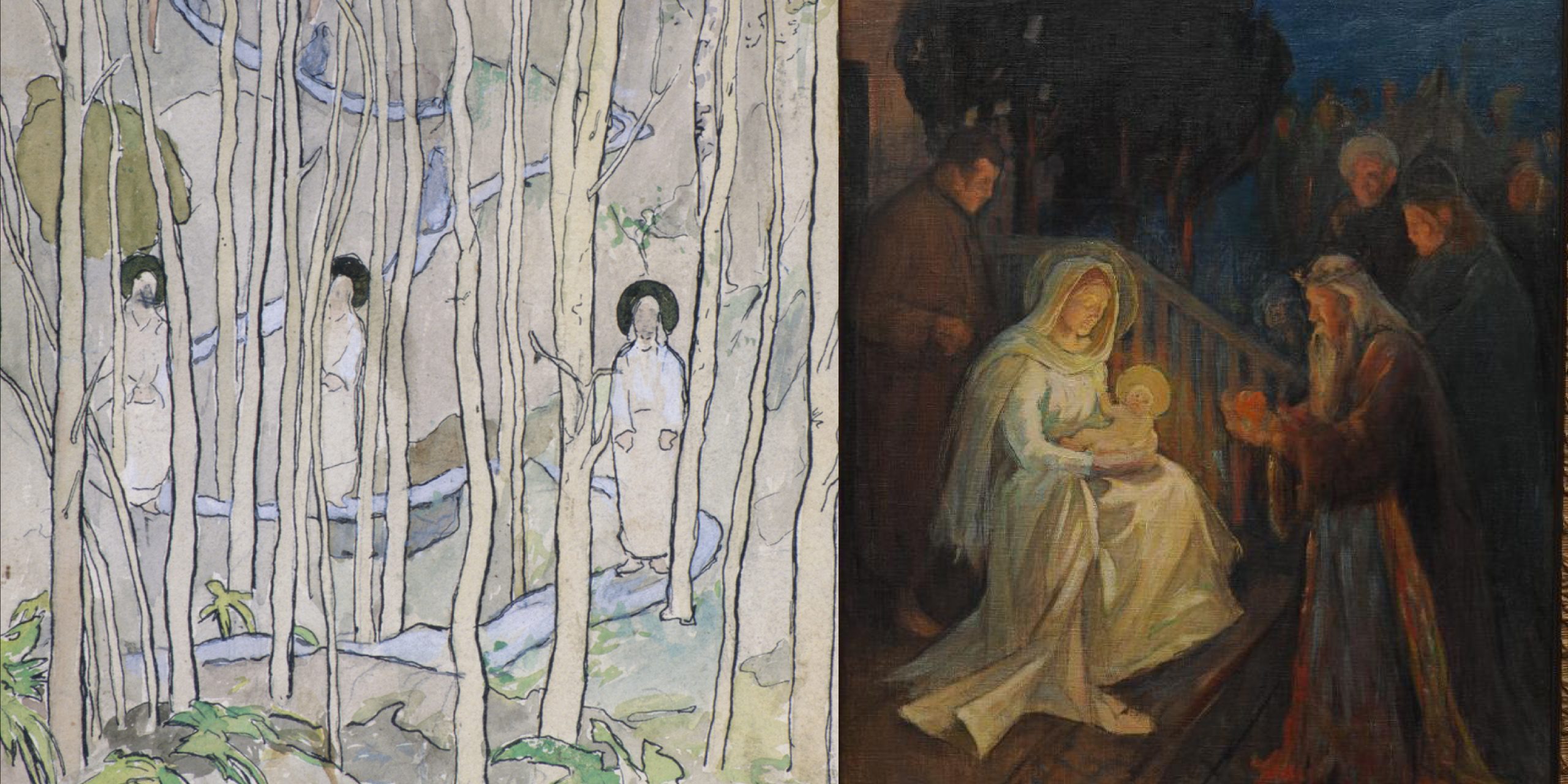 MUISTA ALTTARITAULULUONNOKSISTA on esillä esimerkiksi ensimmäinen toteutunut alttaritaulu, Pedersören kirkon Viimeinen ehtoollinen (1895–96) sekä Kotkan kirkon Kuninkaitten kumarrus (1898–1899). Ateljeen pianonurkkaukseen, joka muistuttaa kotikonserteista, on sijoitettu Halosen Kolme pyhää miestä metsässä (1894) yhdessä Luumäen kirkon alttaritaululuonnoksen Kristuksen kasteen (1913) kanssa. Akvarelli Kolme pyhää miestä metsässä oli Halosen luonnosehdotus hänen synnyinpaikkansa Lapinlahden kirkon alttaritauluksi. Sitä ei tilattu, ja aihetta pidettiin poikkeavana. Näyttelykokonaisuudessa Paul Gauguiniin (1848–1903) yhdistetty teos on moderni.