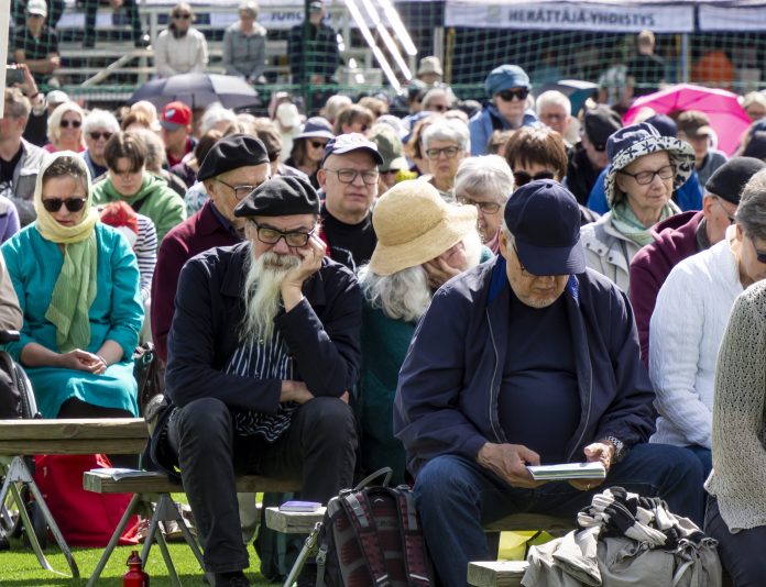 Herättäjäjuhlilla valtaosa seuroista järjestetään juhlakentällä. Juhlien oheisohjelmaan kuuluvat sateenkaariseurat on järjestetty kahtena edellisvuonna kirkossa. Kuva on Salon herättäjäjuhlilta 2025. Kuva: Jukka Granström