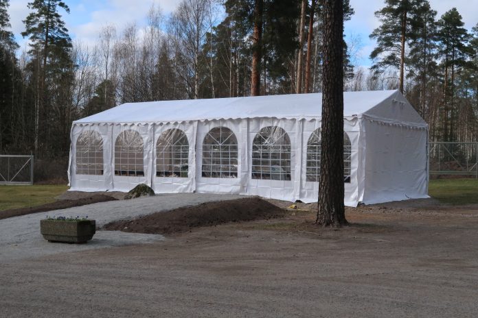 Järvenpään hautausmaan siunauskappelin remontin ajan hautaan siunaamiset toimitetaan teltassa. Kuva: Jussi Rytkönen,
