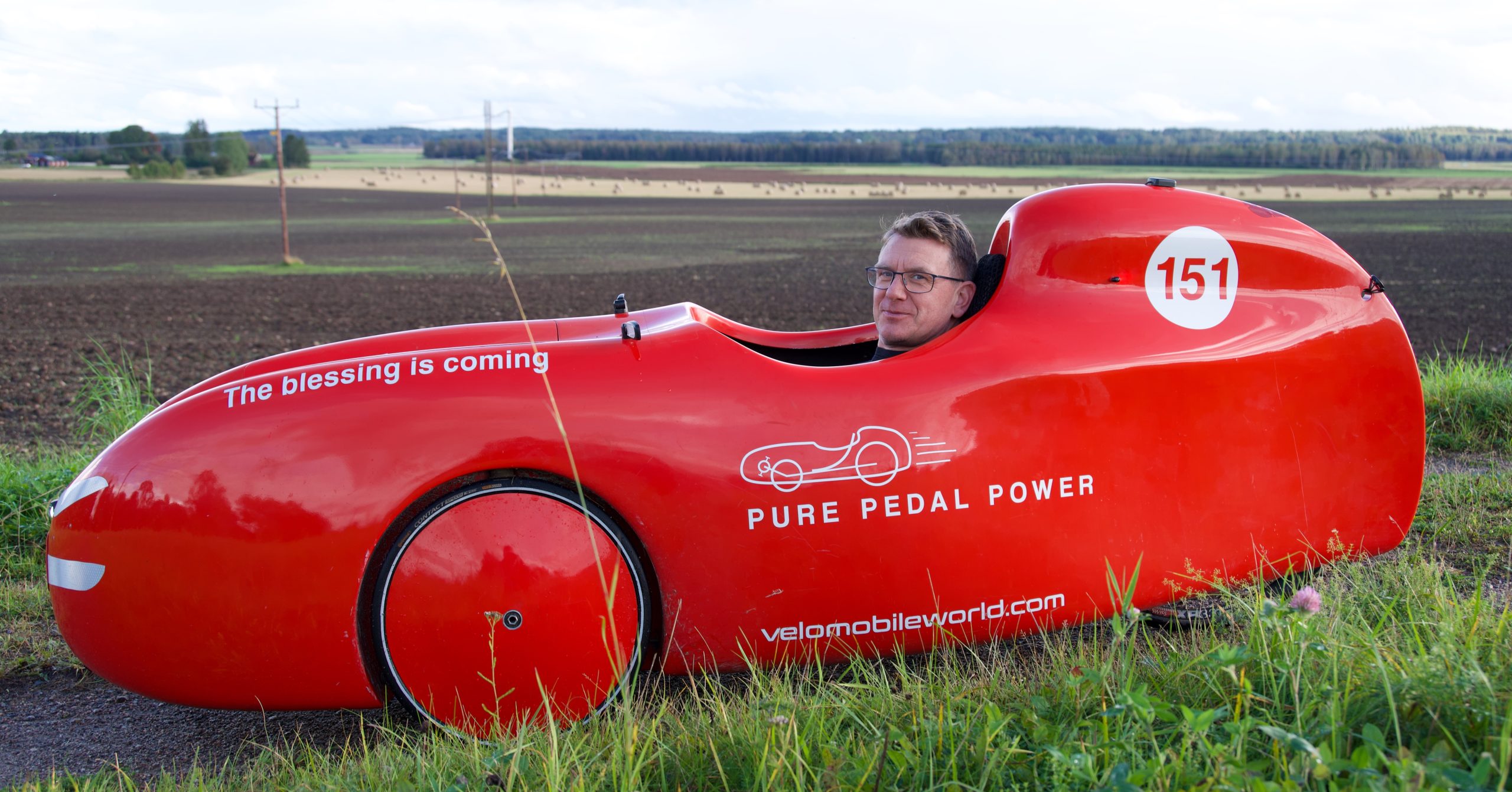 Jonatan Edlundin kinnerin eli velomobiilin keulassa lukee "The blessing is coming", siunaus tulossa. Kinneri-nimi tulee kinnerijänteestä eli akillesjänteestä. Jotkut käyttävät ajoneuvosta nimeä nojapyörä. Virtaviivainen menopeli on kevyt polkea. Kuva: Kaj Aalto