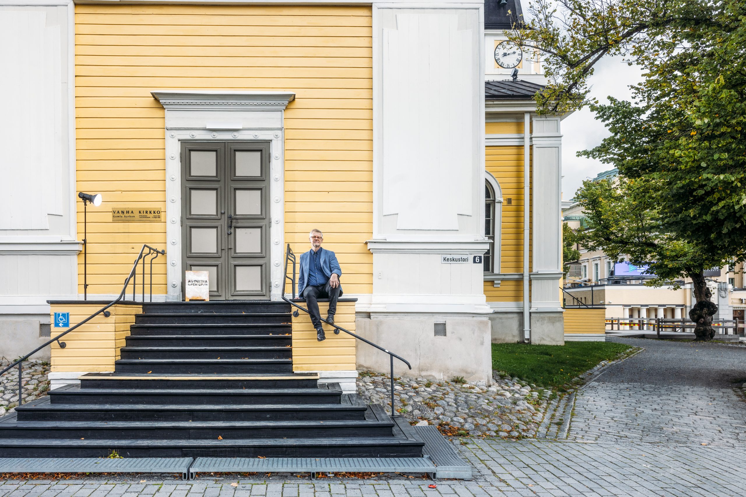 Tampereen Vanhan kirkon ja torin maisemissa Kari Latvus kokee olevansa kahdenlaisen pyhän äärellä. Pyhä on läsnä niin arkisissa kohtaamisissa kuin kirkon sisällä. Kuva: Jani Laukkanen