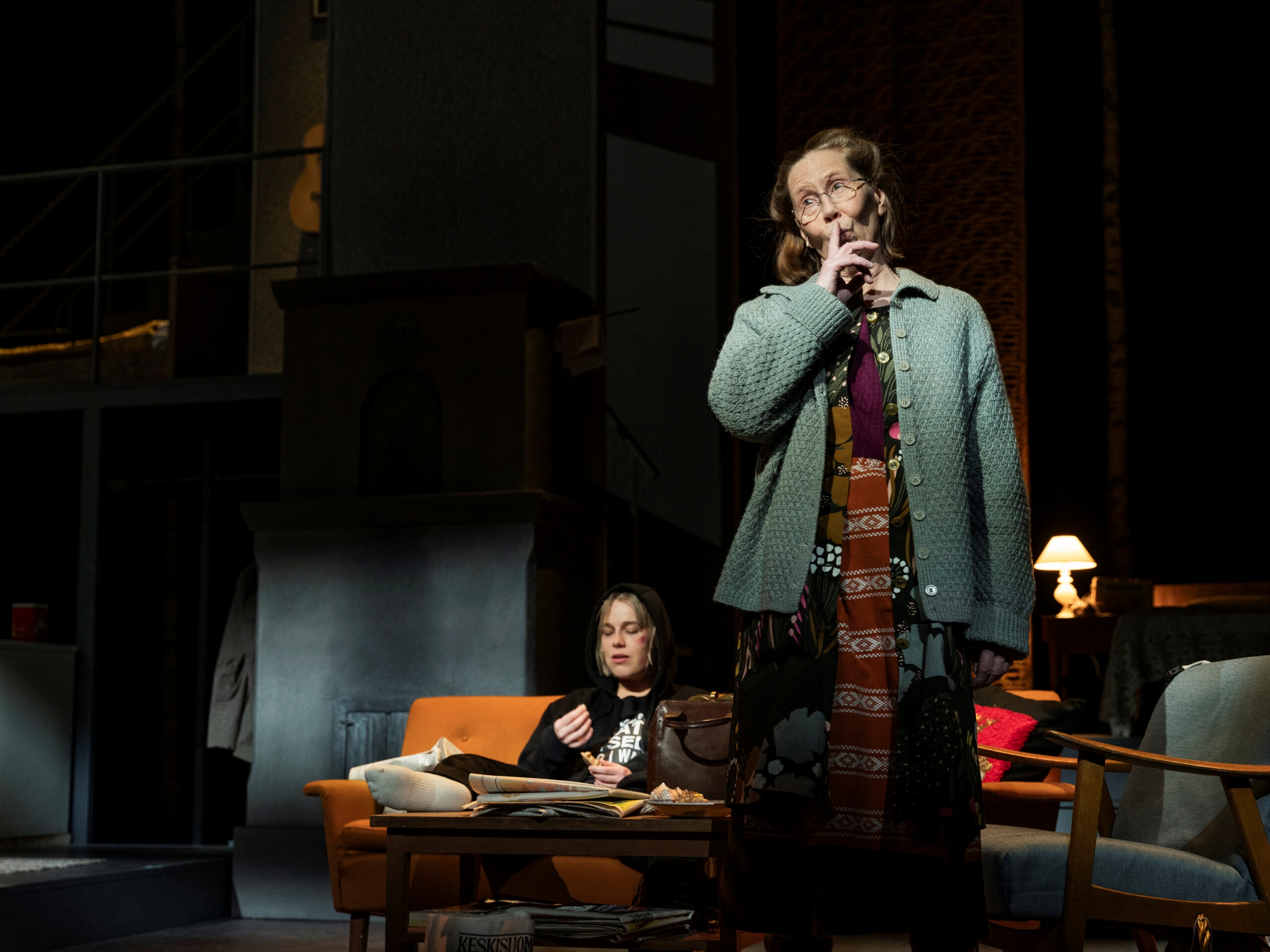 Mamman (Kati Outinen) ja Pojan (Nenna Tyni) yhteinen juttu on lukea kuolinilmoitusten muistovärssyjä. Kuva: Antti Sepponen