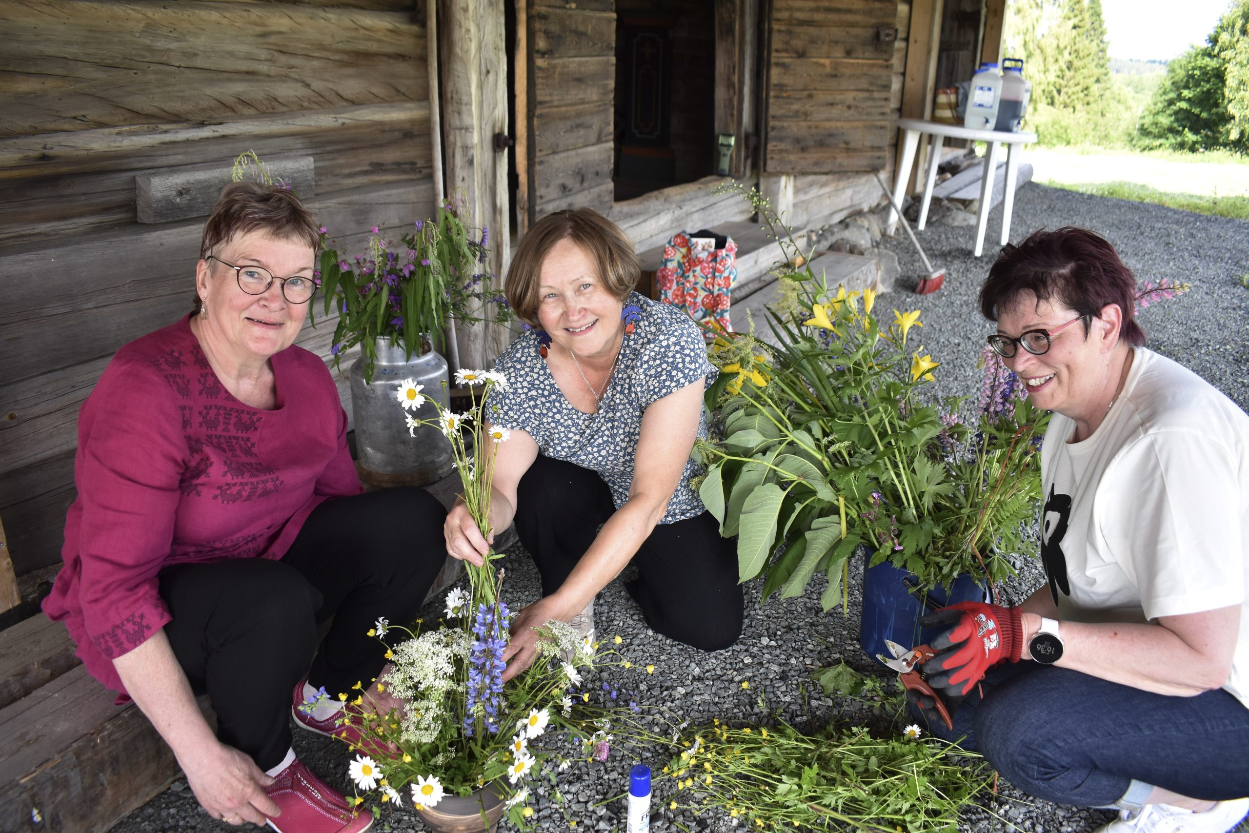 Päästyämme perille Hassinen, Jeskanen ja Kettunen sommittelevat kukkia riihen eteen ja alttarille sekä asettavat juomakanistereita paikoilleen.