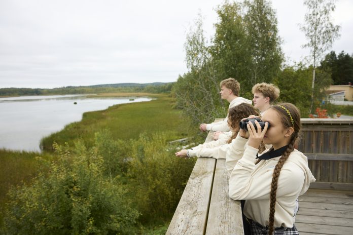 Lempäälän lukio sijaitsee luonnonkauniilla paikalla Ahtialanjärven rannalla. Lintujen bongaaminen ja muunlainen ympäristön seuranta onnistuukin helposti. Kuva: Marjaana Malkamäki