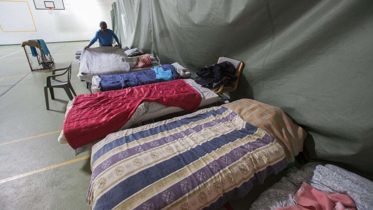 Kuva: Matti Karppinen. Kirkkonummen vastaanottokeskuksessa Evitskogissa majoitustiloja on tehty urheilusaliin.