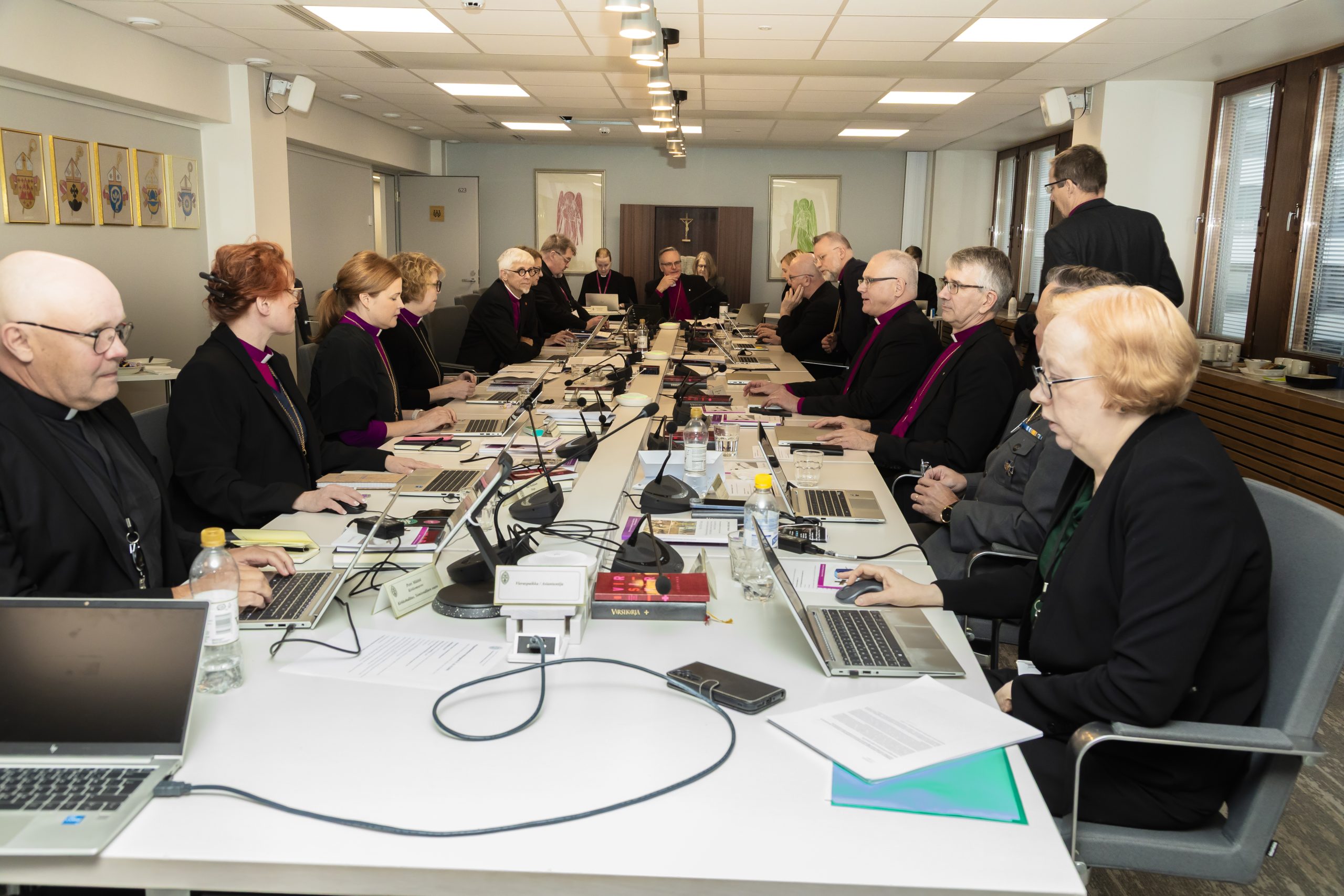 Piispainkokous käsitteli nyt tammikuun 2026 kokouksessaan Sleyltä ja Kansanlähetykseltä saatuja selvityksiä. Kirkon lähetysjärjestöjen ohjauskeskusteluja käsiteltiin ensimmäisen kerran lokakuussa 2025, mistä kokouksesta kuva on. Kuva: Jukka Granström.