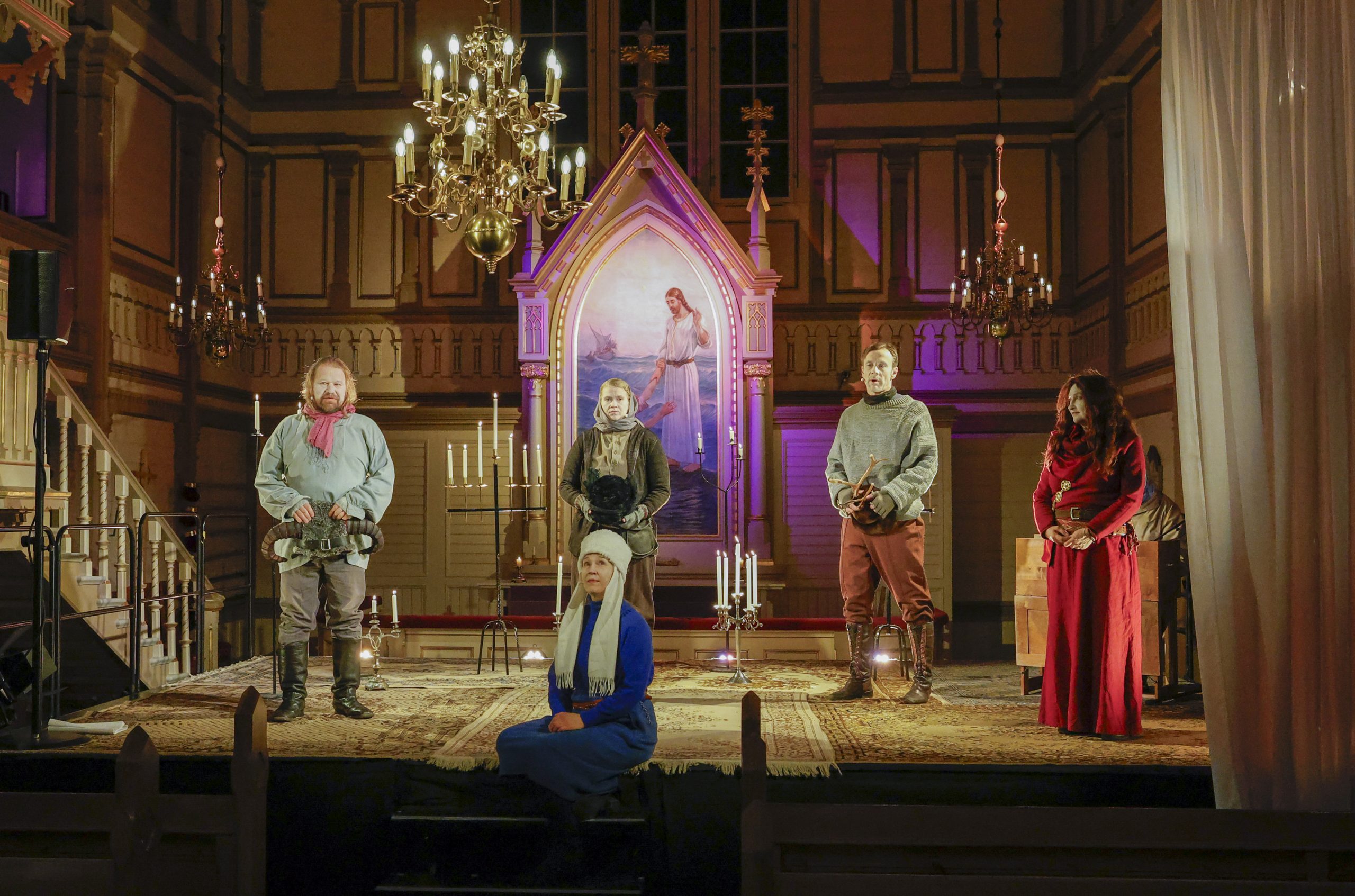 Toivo Tuhkasen alttaritaulu Vapahtaja ja Pietari vetten päällä avautuu uudesta näkökulmasta kirkon etuosaan muodostetulla näyttämöllä. Kuvassa Janne Kinnunen, Heidi Syrjäkari, Milla Kuikka, Jukka Peltola ja Sari Korkkonen. Kuva: Heimo Haverinen