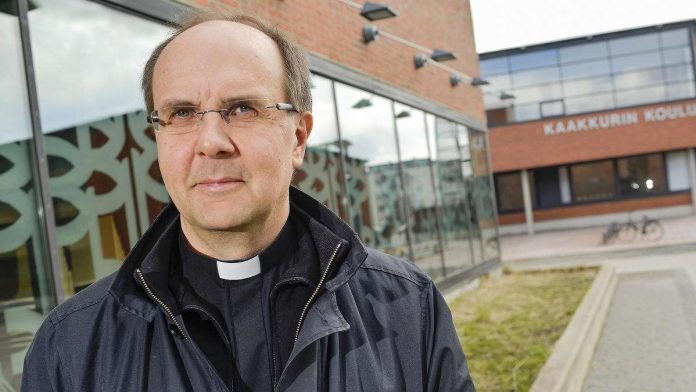 Kuvassa Oulun Karjasillan seurakunnan kappalainen Petri Satomaa, joka vierailee muun muassa oululaisessa Kaakkurin koulussa.