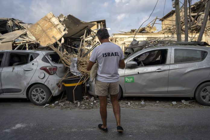 XOB111; Israelis inspect the rubble of a building a day after it was hit by a rocket fired from the Gaza Strip, in Tel Aviv, Israel, Sunday, Oct. 8, 2023. The militant Hamas rulers of the Gaza Strip carried out an unprecedented, multi-front attack on Israel at daybreak Saturday, firing thousands of rockets as dozens of Hamas fighters infiltrated the heavily fortified border in several locations by air, land, and sea, killing hundreds and taking captives. Palestinian health officials reported scores of deaths from Israeli airstrikes in Gaza. (AP Photo), AP / LEHTIKUVA / ODED BALILTY