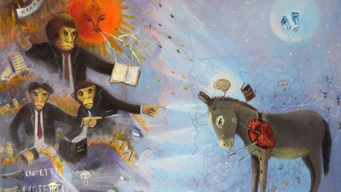 Päivi Räsäselle lahjoitettavassa Komitea-teoksessa on lauma apinoita, jotka syyttävät yksin jätettyä, itkevää aasia. Taulussa on viittauksia myös Harmageddonin taisteluun.