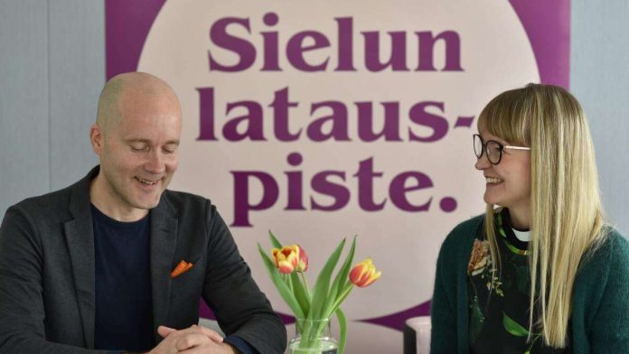 Kuva: Antero Harju / Vantaan seurakunnat. Sielun latauspiste -videosarjan ensimmäisessä jaksossa yhdysvaltalaisen totuus- ja sovittelukeskuksen johtaja Antti Pentikäinen keskustelee sovinnosta viestintäpäällikkö, pappi Meri-Anna Hintsalan kanssa.